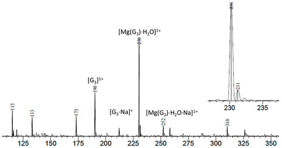 To determine the presence of the desired product from the synthesis of MgG3, a mass spectrum of the dried MgG3 resuspended in 18 MΩ H2O indicated the presence of the free [HG3]1+ ligand, and the subsequent sodium adduct [HG3·Na]+ predicted at 190 m/z and 212 m/z, respectively, as well as presence of the monoaqua triglycine magnesium chelate [MgG3 + H2O]+ and the subsequent sodium adduct [MgG3 + H2O + Na]+ at 230 m/z and 252 m/z, respectively, as indicated by Figure 1.