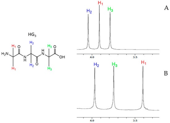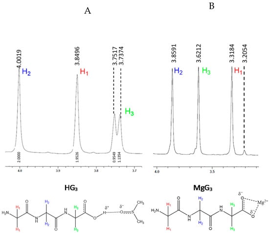 It is well established, in the literature, that divalent metal amino acid chelates exhibit ligand chelation predominantly through the carboxylic acid hydroxyl group and the nearest amine (e.g., glycine and glutamate) [43,44], but entropically-favored tri- and tetradentate complexes will occur primarily (e.g., aspartate) [44]. Ligand chelation to magnesium typically results in an observable shift of the proton signals adjacent to the Lewis bases of the free ligand that participate in coordination, as a consequence of the electropositive character of the metal [47,48,49]. Subsequently, 1H-NMR was conducted on both the free HG3 ligand and purified MgG3 in 700 μL of H2O/D2O (1:6 (v:v)). The uncomplexed HG3 exhibited three singlets at 4.044, 3.914 and 3.786 ppm, whereas the MgG3 complex showed an observable shift for each of the proton peaks at 3.967, 3.747, 3.4077, respectively (Figure S6), indicating a confirmed upfield shift of 0.5 ppm for H1 and 0.1 ppm for H2, and a tentative shift of 0.04 ppm assigned to H3 within the realm of experimental error (Figure 2).