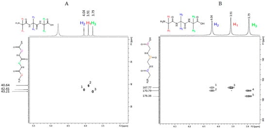 Subsequently, 2D HSQC and HMBC were conducted on MgG3. The most significant change in the spectrum was observed for the H3 proton (Figure 5), which supports that the terminal amine is also involved in magnesium chelation. The combination of both the 1D- and 2D-1H-NMR studies suggests that all available Lewis bases of HG3 are coordinated to the magnesium metal via an N3O donor set, as the formation of a bidentate ring structure of this size is unlikely and implicates HG3 as a tetradentate chelate with the Mg2+ cation. This is further supported by the presence of a protonated backbone amide stretch [50] observed on the spectra of the HG3 ligand FT-IR that is not observed for the MgG3 complex (Figure S2).