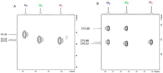 2D HSQC of HG3 (A) showing a single coherence point between each proton and its corresponding carbon (1:1:1) and the 2D HMBC of HG3 (B) showing two correlation points between H2 and two carbons (C2–167.8 ppm; C4–170.8 ppm) and H3 and two carbons (C4–170.8 ppm; C6–176.4 ppm), as well as one correlation point between H1 and one carbon (2:1:2). Full spectra available in Supplemental Figure S10.