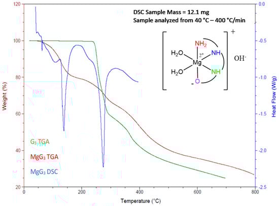 Chemical composition determination of MgG3 was carried out utilizing TGA/DSC and elemental analysis. The TGA of both HG3 and MgG3 showed stability until about 240 °C—most likely due to the extensive hydrogen bond network of the ligand as described by Srikrishnan et al. [59].