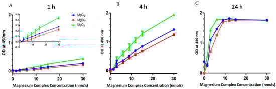Sample solutions for use with the colorimetric assay were prepared in house—each sample being 150 μM. The samples tested included magnesium chloride (MgCl2), magnesium bisglycinate (MgBG) and MgG3. Each well contained a total volume of 150 μL (50 μL of cells in ultrapure H2O, 50 μL of buffer/enzyme/developer mix, and varying amounts of sample from 0 to 20 μL brought to total volume with 18.2 MΩ H2O to desired well concentration). To conduct the assay, 50 μL of cells in ultrapure H2O was added to each well with a multichannel micropipette. Subsequently, the required volume of sample was added to each well and brought to volume with ultrapure H2O. To ensure a consistent starting time point, 50 μL of the magnesium buffer/enzyme developer mix was added to each well with a multichannel micropipette. The plate was incubated for approximately 1 h and then placed in a Flexstation 3 plate-reading spectrofluorometer to analyze well absorbance at 450 nm. Each well was analyzed at 37 °C for endpoint value over nine full plate scans with 3 scans/well/plate scan (a total of 27 scans per well) and the reported value of each well was the average value of these scans after background subtraction. Data was collected at 1, 4 and 24 h. Raw data was reduced and plotted as absorbance value against the magnesium concentration of each well. All assays were repeated as triplicate independent runs—error bars shown in graph (Figure 7). All data shown as ± SEM (MgCl2 = 0.029, MgBG = 0.025, MgG3 = 0.053; Upper 95% C.I.: MgCl2 = 0.168, MgBG = 0.123, MgG3 = 0.278; Lower 95% C.I.: MgCl2 = 0.031, MgBG = 0.001, MgG3 = 0.024).