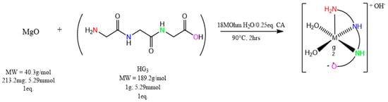 Synthesis of MgG3 Synthesis was conducted at 1:1 molar equivalent of MgO and HG3, a 0.25 eq of citric acid (CA) was added to aid in MgO solubility.