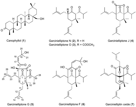 - Grossman, R.B.; Yang, X.W. Structural Revision of Garcinielliptin Oxide and Garcinielliptone E. J. Nat. Prod. 2020, 83, 2041–2044. [Google Scholar] [CrossRef]
