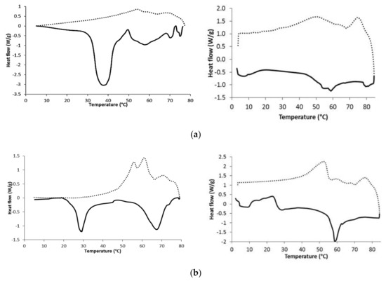 Differential scanning calorimetric profiles of neat waxes (left panel) and their lipidic matrix systems with lemon oil (right panel). Straight and dotted lines correspond to the heating and cooling modes, respectively. (a); beeswax (b); candelilla wax (c); carnauba wax, and (d); ozokerite wax.