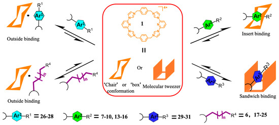 We summarize the host–guest binding modes inferred for the complexes formed between 1 and different anionic carboxylate species in Table 1, and these modes are shown schematically in Figure 1. It was found that most aromatic anions with “widths” less than 5.8 Å thread through the cavity of macrocycle 1 to form pseudorotaxanes. For ease of reference, this was termed the “insert” binding mode (Figure 1) [38,47,48,50]. Meanwhile, in the case of larger conjugated aromatic anions, it was found that TxSB 1 can serve as “molecular tweezers”, giving rise to sandwich-like complexes. In contrast, linear aliphatic anions and aromatic anions with “widths” larger than 5.8 Å bind preferentially to the exterior of 1 (Figure 1).