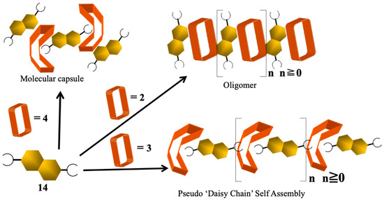 Schematic showing how the substituents defining a particular p-terephthalic acid dianion (PTADA) serve to stabilize various supramolecular constructs via interaction with the cationic macrocycle 1. Modified with permission from a figure that first appeared in ref. [54]. Copyright 2020 American Chemical Society.