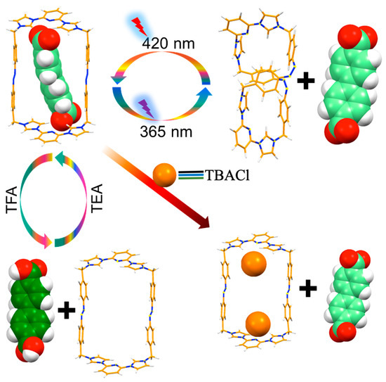 Cartoon representation of the multi-responsive capture-and-release of guest by TxSB 5, including photo-, pH-, and anion-responsiveness. Reproduced from ref. [44]. Copyright 2019 American Chemical Society.