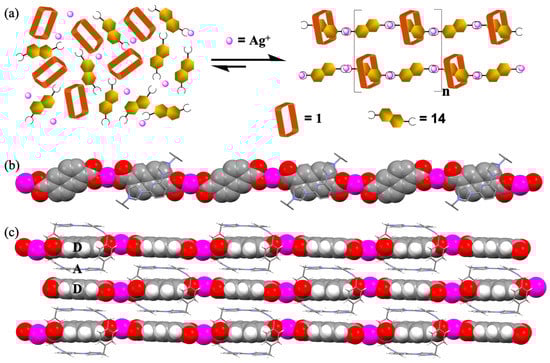 (a) Assembly of a silver-linked polypseudorotaxane constructed from TxSB 1, Ag(I), and the 2,6-naphthalenedicarboxylate dianion. (b) Top and (c) side views of the silver-linked polypseudorotaxane chain seen in the solid state. A and D stand for acceptor and donor, respectively. Note: Compound numbers are provided in Table 1. Modified with permission from a figure that first appeared in ref. [51]. Copyright 2011 American Chemical Society.