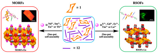In order to study the metal cations dependence on the supramolecular self-assembly involving TxSB 1 and anions, the terephthalate dianion was investigated, in combination with trivalent lanthanide cations [53]. In the absence of these cations, the terephthalate dianion favors an “outside” binding mode in interacting with 1. However, selected trivalent lanthanide metal cations, in particular, Nd3+, Sm3+, Eu3+, and Tb3+, were found to induce the terephthalate dianion to insert into the cavity of macrocycle 1 to form MORFs (Figure 6). In contrast, several other lanthanide metal cations, e.g., Y3+, Gd3+, Er3+, Tm3+, and Lu3+, were found to interact with 1 and the terephthalate dianion to form unusual rotaxanated supramolecular organic frameworks (RSOFs).