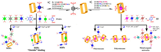 Substituent effects always play critical roles in regulating chemical reactions, as well as self-assembled structures. Appreciating this, we explored how different substituents on various putative anionic guests would affect their interactions with the TxSB 1 [54]. Monosubstituted or para-disubstituted derivatives on the terephthalate dianion favor formation of pseudorotaxane structures when allowed to interact with 1. In contrast, the p-terephthalic acid dianion (PTADA), and its derivatives (2,3-di(OH PTADA), 2,6-di(OH PTADA) and 2,3,5,6-tetra(Cl) PTADA), lead to complexes where the substrate is bound to the outside of 1 (Figure 7). The different binding modes stabilized by the various PTADA derivative were, in turn, found to modulate further supramolecular self-assembly when the self-assembly process was carried out in the presence of selected metal cations (M). In fact, a number of self-assembled ensembles could be constructed, including one-dimensional polyrotaxanes, outside-type rotaxanated supramolecular organic frameworks (RSOFs), and two-dimensional metal−organic rotaxane frameworks (MORFs), depending on the particular choice of PTADA derivative and metal cation (M = Co2+, Ni2+, Zn2+, Cd2+, Gd3+, Nd3+, Eu3+, Sm3+, Tb3+).