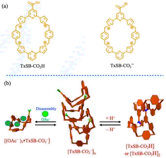 (a) Chemical structures of TxSB-CO2H and its corresponding base TxSB-COO−. (b) Schematic view of self-assembly of a supramolecular polymer constructed from mono functionalized TxSB-CO2–, which proved both anion and pH responsive (see text for details). Reproduced from ref. [39]. Copyright 2018 American Chemical Society.