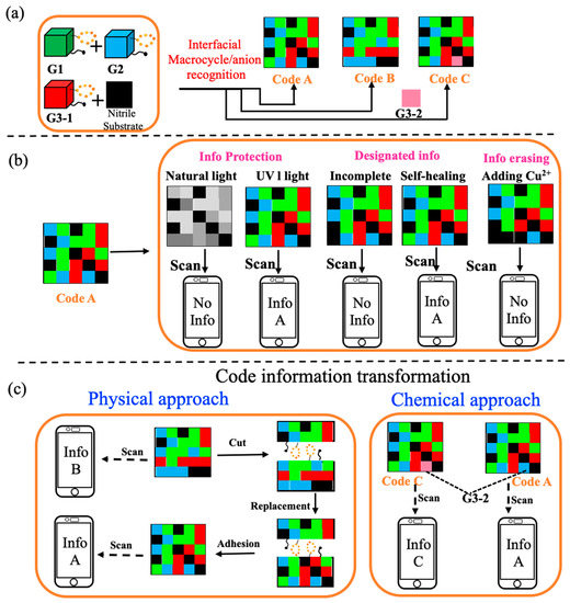 (a) Cartoon representation of construction of 3D color codes through the interfacial adhesion of various colored hydrogels. (b) Code used for information protection, designated information, and information erasing. (c) Schematic view showing how initially encrypted information could be transformed by physical and chemical means. Reproduced with permission from ref. [56]. Copyright 2018 Wiley-VCH.