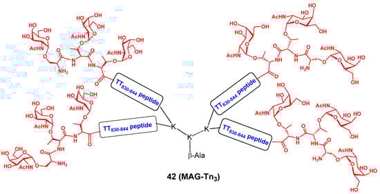 As stated above, owing to their over expression in a number of cancer cells, TACAs from the group of O-linked mucins have been the subject of intense activity to generate anti-carbohydrate cancer vaccines [,,,]. The group of Bay et al. reported a fully synthetic anti-cancer vaccine for human use [,]. The new vaccine prototype, named MAG-Tn3 (42), is a tetrameric glycopeptide grafted on L-lysine dendrimer incorporating trimeric residues of the carbohydrate tumor-associated Tn antigen (α-D-GalNAc-O-R) and a CD4+ T-cell peptide epitope extracted from the highly immunogenic sequence of tetanus toxin (Figure 3). One major obstacle to vaccination is the high degree of MHC polymorphisms in the human population. Potential broad coverage can, however, be potentially accomplished by using promiscuous T-helper epitopes recognized by several of the common MHCs. One such “universal” T-helper cell epitope has been identified from tetanus toxin (TT). It is derived from the TT830–844 peptide sequence. Hence, the above group used such tetanus toxin-derived peptide segment as CD4+ T-cell epitope. The study successfully demonstrated that the vaccine-induced Tn-specific mouse antibodies mediated the killing of human Tn-positive tumor cells. The synthetic vaccine is currently being investigated in breast cancer patients (Phase I clinical trial). For the clinical trials, the vaccine was formulated with the recent GSK AS15 immuno-stimulant (CpG7909, monophosphoryl lipid A (MPL), and QS21) as a liposomal formulation. It has been shown to stimulate both innate and humoral responses. Patients with localized breast cancer with a high-risk of relapse were immunized with the above vaccine cocktail. The initial results of the clinical trial demonstrated that patients developed high levels of Tn-specific antibodies. These antibodies specifically recognized Tn-expressing human tumor cells which were killed through a complement-dependent cytotoxicity mechanism (CDC). This work illustrated that heterofunctional dendritic carbohydrate-bearing nanoparticles (NPs) could be attractive cancer vaccines. An analogous TACAs vaccine has been similarly described in the author’s laboratory []. It incorporated a related disaccharide known as the Thomsen–Friedenreich antigen (Galβ1-3GalNAc-α-O) and the work has been previously reviewed [].