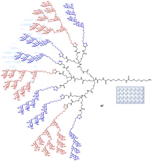 To better understand the effects of carbohydrate density, flexibility, multivalency or steric hindrance due to proximity effect, Wong et al. [] used heterofunctional dendritic glycan microarrays. To control the ratio of the mixed glycans more precisely, Wong and co-workers attached heterogeneous glycans to an AB3-type second generation dendrimeric scaffold (TRIS) (Figure 4). Two glycans, Man4 and Man9, were conjugated to the scaffold at different ratios to give a set of oligomannose constructs analogous to 67. These oligomannose dendrons were then printed onto an NHS-activated glass slide to form an array of conjugates with various densities. Amongst these, heterogeneous oligomannose glycodendron 67 had the strongest binding affinity (KD 13 nM) to 2G12 HIV-anti-gp120 antibody among the five oligomannose dendrons synthesized.