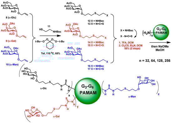 Hence, allyl glycosides 8–10 have been treated under radical initiated thiol–ene reaction catalyzed by 1,1-di(t-butylperoxy)cyclohexane in the presence of Boc-protected aminoethanethiol 11 to afford peracetylated sugar 12, 14, and 16 (Scheme 1). Boc-deprotection with TFA in DCM and treatment with thiophosgene led to isothiocyanates 13, 15, and 17, respectively. Each sugar was then sequentially added in varied molar ratios in DMSO at room temperature to the PAMAM dendrimers from G3 to G6 and blocking the remaining free amine groups with PEG-dimer having an isocyanate function at one end. After sugar de-O-acetylation under standard Zemplén conditions (NaOMe, MeOH) and purification by dialysis and ultrafiltration, heterofunctional glyco-PAMAM-dendrimers were obtained and characterized by 1H-NMR and MALDI-TOF mass spectrometry. The necessity to add the PEG-dimer resulted from the lack of complete sugar modifications due to steric factors, even under forcing conditions (temperature, excess sugar isothiocyanates).