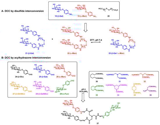 Generation of Dynamic Combinatorial Carbohydrate Library using (A) disulfide equilibrium or (B) aldehyde-hydrazine interconversion into acylhydrazones [,].