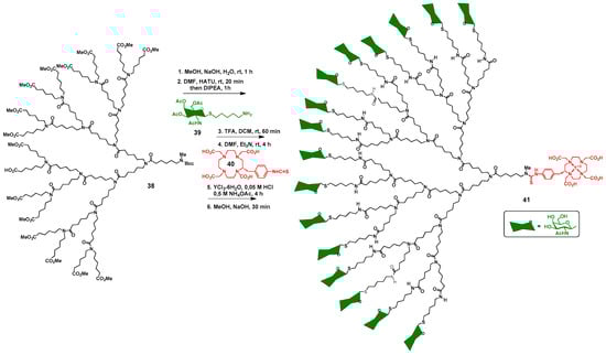 Interestingly, to this arsenal of glycodendrimers of therapeutic values against cancer, there is an additional avenue that was recently investigated. It has been referred to as clearing agents (CAs) that are used following radioimmunotherapy (RIT) to remove the excess of unwanted and noxious radioactive agents with the help of sugar dendrimers binding to liver receptors for catabolism []. RIT uses a monoclonal antibody (mAb) labeled with a radionuclide to deliver cytotoxic radiation to cancerous target cells []. A few examples consisted of yttrium (90Y)-ibritumomab tiuxetan (Zevalin), iodine (131I)-tositumomab (Bexxar), or lutetium (177Lu)-lilotomab satetraxetan (Betalutin) []. The radionuclide is usually bound to the mAb of interest through a chelating agent such as S-2-(4-aminobenzyl)-1,4,7,10-tetraazacyclododecane tetraacetic acid (DOTA, 40) (Scheme 3).