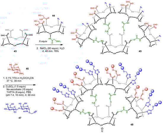 An appealing additional strategy was recently published that targeted both Tn and TF antigens []. Since most TACAs antitumor vaccines published thus far contained only a single target carbohydrate antigen resulting in the incomplete destruction of heterogeneously glycated cancer cells, the authors sought to incorporate two of the most studied TACAs described above. To this end, they used their typical orthogonal chemoselective ligation strategy to prepare fully synthetic glycosylated cyclic peptide scaffolds grafted with both Tn (46) and TF (47) antigens (Scheme 4). To this end, cyclic peptide 43 harboring four aldehyde groups, prepared by solid-phase peptide synthesis (SPPS), was coupled to orthogonally protected aminooxy derivative 44 to provide hexadecavalent scaffold 45 containing orthogonal functionalities (aldhehyde/azide) (Scheme 4). The alternatively substituted aldehydo-azide 45 was then treated with aminooxy α-D-GalNAc (Tn antigen) derivative 46 using TFA as catalyst. This was followed by a copper catalyzed cycloaddition (CuAAC) between the azide-substituted intermediate (not shown) and an alkynyl disaccharide (TF antigen) 47, which afforded the hexadecavalent vaccine precursor 48.