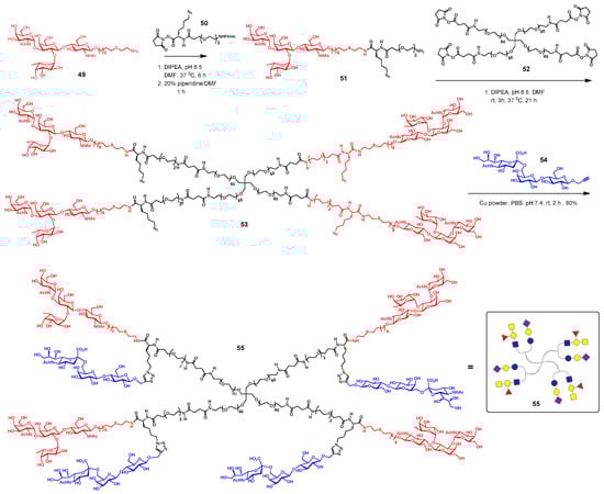 Synthesis of an octameric heterobifunctional glycoconjugate (55) using an orthogonal ligation strategy for the coupling of an amino-ending human blood group antigen in red (blood group A-type II) (49) serving as ligand for B-cells and a CD22 siglec ligand in blue (sialyl α-(2→6)-lactose) (54) [].