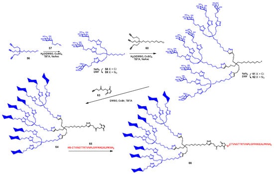 Toward achieving these vaccine candidates, the “onion peel” type [,,,] dendron approach has been used (Scheme 6). Typically, tris-propargylated scaffold having a diethylene glycol linker 56 was treated with 2-azidoethyl α-D-mannopyranoside 57 under Copper(I)-catalyzed azyde-alkyne Cycloaddition (CuAAC) conditions (H2O/DMSO, CuSO4, NaAsc, TBTA) to afford glycodendron trimer 58. After chloride to azide substitution (NaN3, DMF), intermediate 59 was again treated under similar CuAAC conditions, but using a triethylene glycol linker 60 to provide nonameric glycodendron precursor 61. Analogous chloride to azide exchange, 62 was treated under slightly different CuAAC conditions (DMSO, CuBr, Tris((1-benzyl-4-triazolyl)methyl)amine (TBTA)) with linker 63 to give a maleimido-ending glycodendron 64. Coupling with synthetic olive allergenic peptide OE109−130 possessing a cysteine residue at the N-terminal (65) under Michael thiol–ene afforded the desired vaccine candidate 66 with the suitable properties described above.