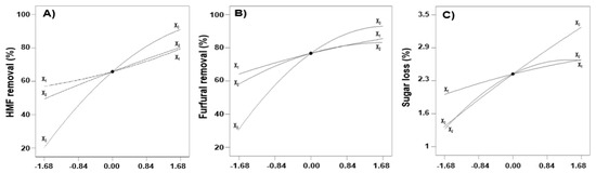 Effect of independent variables on 5-HMF removal (A), furfural removal (B), and sugar loss (C). Each level of variable was expressed as code values. Extraction temperature (X1); extraction time (X2); S-L ratio (X3).