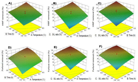 Response surface curves representing the effects of detoxification process conditions including extraction time, extraction temperature, and S-L ratio on 5-HMF and furfural removal. Time versus temperature (A,D); temperature versus S-L ratio (B,E); S-L ratio versus time (C,F).