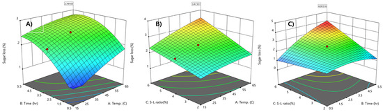 The response surface curve was developed for the evaluation of sugar removal from APH with varying extraction temperatures and times at a fixed S-L ratio of 4.0% (Figure 3A). Sugar removal increased with extraction temperatures and a maximum sugar removal of 2.78% was obtained with increased temperatures and times within the chosen experimental range. The response surface curve in Figure 3B shows sugar removal of APH as a function of extraction temperature and S-L ratio. Higher sugar removal was obtained with a higher extraction temperature and a higher S-L ratio.