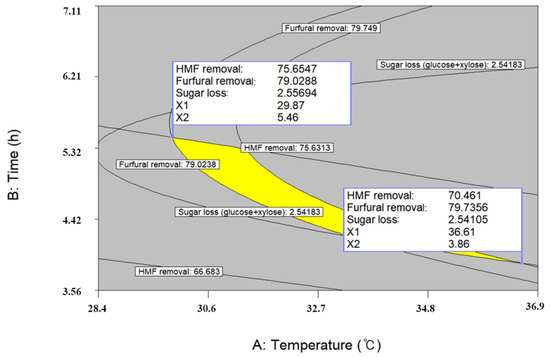 In the previous experiment, it was confirmed that the fermentation inhibitor could be effectively removed using activated carbon without significant sugar loss, and further optimization is required to minimize sugar loss and maximize fermentation inhibitor removal. Optimum conditions were obtained by superimposing of individual response surface curves, and the range of each detoxification condition was set at a temperature from 16.5 to 58.5 °C, a time from 0.5 to 5.5 h, and an S-L ratio from 0.6 to 7.4 %. As shown in Figure 4, the two optimal conditions were derived based on the criteria of minimizing extraction temperature and minimizing the extraction time, respectively. The latter condition was finally determined because short process time is more beneficial for reducing process costs. Then, the optimal detoxification conditions were predicted as 36.6 °C, 3.86 h, and 3.3%, respectively. Under these conditions, the removal of 70.5%, 79.7%, and 2.54% of 5-HMF, furfural, and sugar was predicted, respectively. To verify the predicted values obtained from the statistically-based optimization, a validation experiment was conducted. The removal rates of 5-HMF, furfural, and sugar were 71.6%, 83.1%, and 2.44%, respectively, showing similar results to the predicted values. Therefore, the prediction of the optimal value using the second-order regression models was valid for the optimization of a detoxification process using activated carbon.