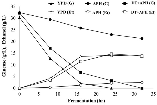 In ethanol fermentation using APH and YPD, the theoretical ethanol yields of 38.5% and 89.3% were obtained, respectively, which confirmed that the fermentation inhibitor in APH adversely affected the ethanol fermentation. After detoxification, acid hydrolysate (DT + APH) produced 13.9 g/L of ethanol, showing a theoretical yield of 84.5%, indicating that the produced ethanol concentration was comparable to the control group (YPD). The production of ethanol was 5.7 times higher than that obtained from APH, indicating that the removal of 5-HMF and furfural increased the production of ethanol. Lee et al. reported that, in the presence of 1–2 g/L of 5-HMF, the growth of S. cerevisiae is rapidly inhibited, and the theoretical yield of ethanol is between 15% and 35%, which is consistent with our results [14]. The glucose concentration profile during fermentation showed that fermentation inhibitors drastically inhibited glucose consumption during the 32 h of fermentation compared to YPD, consuming 11.1 g/L of glucose compared with 30.3 g/L, respectively. However, when APH was treated with activated carbon, glucose consumption improved and was comparable to that of YPD at 32 h.