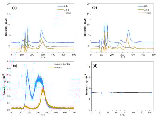 The preservation of samples with the goal of V speciation studies is often based on the addition of a strong chelator (mostly EDTA) on-site and/or prior to analysis in order to stabilise reduced species (if present) against oxidation [18,20]. In order to identify if any changes in vanadium species occur in the sample solution after EDTA addition, a reported sample handling approach was tested in model solutions prior to the analysis of environmental samples [18,20,32,40]. Since predominant species in oxic water samples are expected to be mostly vanadate ions (V(V)), tested model solutions were prepared by using the V(V) standard [1,2]. Stability tests of vanadium species complexed with added EDTA in model solutions at different pH values are shown in Figure 2a,b (UV/Vis detector was used for measurement). It is apparent that the V(V)-EDTA complex shows significant instability at the two different pH values. Under both neutral and acidic conditions, a decrease in peak intensity for V(V) with the time was observed. Measured solutions at pH = 2 showed a reduction in V(V) in V(IV) after a 7-day period. On the other hand, chromatograms of solutions at pH = 7 showed slight changes in peak position after just 24 h, which could possibly be attributed to the slight increase in the pH of the solutions within the measurement time frame [32]. Under acidic conditions, the peak at 280 s elution time, which can be attributed solely to V(IV)-EDTA produced in the reduction processes between V(V) species and EDTA, showed a further increase. A higher reduction rate on lower pH values, in comparison with more alkaline pH, can be attributed to the more pronounced V(IV) stability against oxidation at the lower pH values. V(V) has been already shown to gradually convert to the V(IV) species in the presence of EDTA [41,42,43,44].