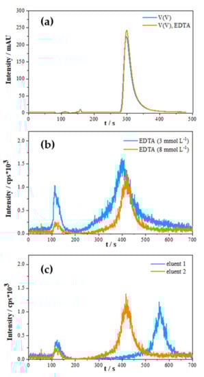 During the process of elution, eluents have to be of sufficient ionic strength to allow retained anions from the sample to be eluted. In the samples of high salinity where the concentration of matrix anions far exceeds the concentration of vanadium species, eluent ions have to efficiently remove retained matrix anions from the sample and allow the on-column anion exchange of V(V)-EDTA complexes. Thus, eluent composition was further optimized by adding ammonium sulphate to the eluent in order to increase the ionic strength of the eluent. A comparison of IC-ICP-MS chromatograms obtained with eluent composition suggested by Li and Le (2007) [18] (eluent 1) and our optimized eluent solution (eluent 2) is presented in Figure 3c. The most obvious differences are in retention times and “pre-peak” intensities.