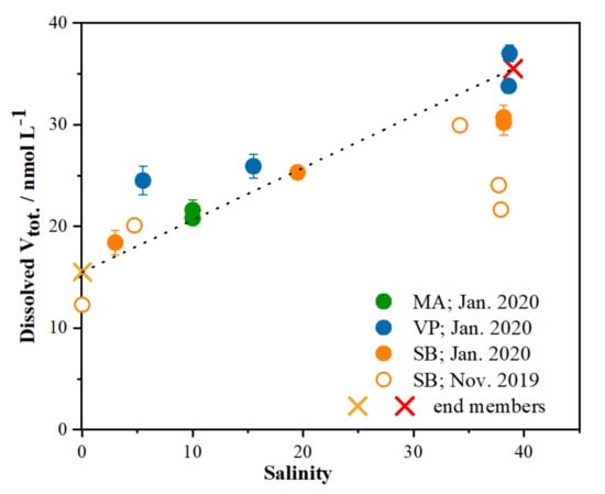 The relationship between the total dissolved vanadium concentration and salinity at the MA (green circles), VP (blue circles) and SB (full orange circles—January 2020; empty orange circles—November 2019) sites. The theoretical dilution line between the two end members, open sea (red cross) and the Krka River (light brown cross), is represented by the black line.