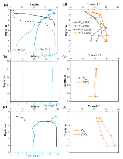 Vertical profiles of salinity and dissolved oxygen, and total dissolved V (full circles) and dissolved V(V) (empty circles) for SB (a and d), MA (b and e) and VP (c and f) sites. Dashed lines on panel (a) as well as grey symbols on panel (d) represent November 2019 sampling at the SB station, while the rest of the data represent January 2020.