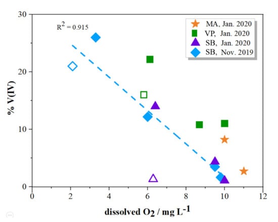 It is interesting to note that in January 2020, at the SB sampling site, V(IV) in the bottom layer was not observed. However at the bottom layer of VP sampling site V(IV) was detected (up to ~15% of total dissolved V), although the O2 concentration between sampling sites differed only slightly (Figure 6, empty marker points). It is likely that the adsorption of V(IV) onto particles and colloids occurred, especially in the upstream parts of the estuary where the enrichment of particulate matter was reported [12].