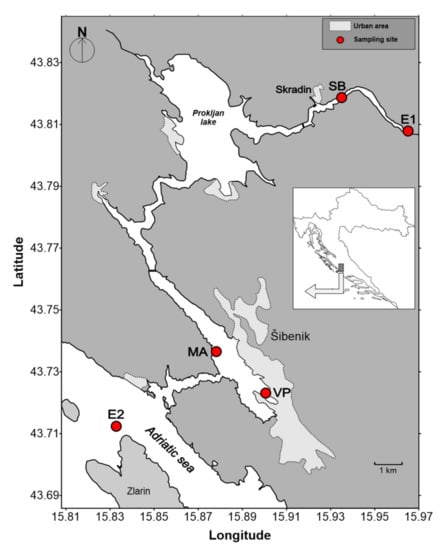 The sampling sites were selected to represent typical estuarine zones of varying anthropogenic input, physico-chemical gradients and biological activity [57,59]. Sampling was conducted on November 2019 and January of 2020 at three different locations along the Krka River estuary (Figure 7): Skradin bridge (denoted as SB), Martinska (denoted as MA) and Vrnaža port (denoted as VP), as well as two end-member locations: the Krka River water above the Skradinski Buk waterfalls (E1) and coastal seawater (E2). With the exception of two end members and the MA sampling station (where the brackish layer was sampled only), samples of the surface brackish layer, freshwater–seawater interface and seawater layer were collected at the remaining two sampling sites. Salinity of processed sampling sites varied from 4 to 38 salinity units (additionally shown in Section 2.2, Figure 4).