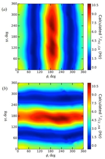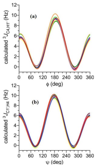- Hadad, M.J.; Zhang, W.; Turney, T.; Sernau, L.; Wang, X.; Woods, R.J.; Incandela, A.; Surjancev, I.; Wang, A.; Yoon, M.-K.; et al. NMR Spin-Couplings in Saccharides: Relationships Between Structure, Conformation and the Magnitudes of JHH, JCH and JCC Values. In NMR in Glycoscience and Glycotechnology; Kato, K., Peters, T., Eds.; Royal Soc. Chem.: London, UK, 2017; pp. 20–100. [Google Scholar]