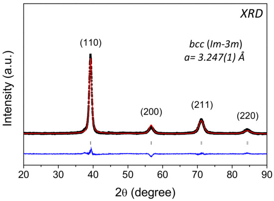 The new HEA with composition Al0.10Ti0.30V0.25Zr0.10Nb0.25 was successfully synthesized by arc melting and adopts a bcc structure (Im-3m) with lattice parameter abcc = 3.247(1) Å and Rietveld analysis showing a good fitting for a single-phased solid solution (Figure 1). Similar results were reported for the quaternary alloy Ti0.325V0.275Zr0.125Nb0.275 (abcc = 3.261(1) Å) [22], see a comparison in Figure SI1 of the supporting information. The decrease of lattice constant by Al addition can be explained by the reduction of Zr concentration from 12.5 at.% for the quaternary to 10.0 at.% in the quinary composition, Zr being the largest element in the alloy (the elements Al, Ti, V, Zr, and Nb have the following atomic radii: 1.43, 1.45, 1.31, 1.59, and 1.43 Å, respectively [23]). Moreover, Al has comparable atomic size to Ti and Nb and consequently, the size disparity in the HEA is reduced and the lattice distortion, as defined previously in [24], decreases from δ = 6.0 to 5.5 for Ti0.325V0.275Zr0.125Nb0.275 and Al0.10Ti0.30V0.25Zr0.10Nb0.25, respectively.