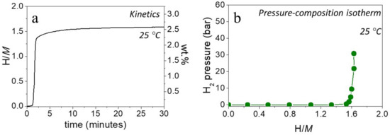 The hydrogenation of Al0.10Ti0.30V0.25Zr0.10Nb0.25 was carried out in a single aliquot at room temperature, and the final equilibrium pressure was around 25 bar. The kinetic plot in Figure 2a shows rapid absorption after a short incubation time (~1 min) reaching almost full capacity within the first 5 min of hydrogen exposure. The maximum hydrogen capacity of the alloy was 1.6 H/M (2.6 wt.% gravimetric capacity). The PCI measurement in Figure 2b reveals a hydrogenation profile with a single step up to a maximum of 1.6 H/M and an equilibrium pressure in the range or below 10−2 bar at 25 °C. A precise value of the equilibrium pressure was not recorded due to the limits of detection of the pressure transducers (10−2 bar). A second pressure-compositions isotherms (PCI) measurement recorded at 100 °C also shows a single plateau with a low equilibrium pressure, see Figure SI2.