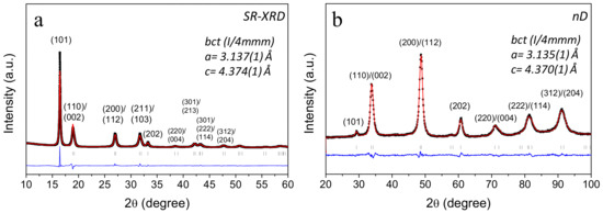 The structural properties of the hydride/deuteride phases were characterized by synchrotron radiation X-ray diffraction (SR-XRD) and neutron diffraction (nD), respectively (Table 1). The SR-XRD diffraction pattern of the hydride phase (1.6 H/M) in Figure 3a shows a single-phased hydride phase adopting a bct structure (I4/mmm) with the lattice parameters abct = 3.137(1) Å and cbct = 4.374(1) Å, as determined from Rietveld analysis. The neutron diffraction pattern in Figure 3b also shows a good fitting with a bct structure with the lattice parameter abct = 3.135(1) Å and cbct = 4.370(1) Å, in very good agreement with the SR-XRD results. The hydrogen/deuterium atoms were located in the tetrahedral interstitial sites of the bct structure ((0, 1/2, 1/4) and (0, 1/2, 3/4)), in agreement with previous studies [9].
