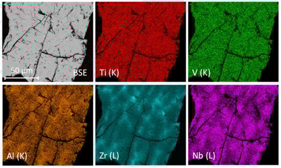 The chemical analysis by energy-dispersive X-ray spectroscopy (EDS) of the hydride phase in Figure 4 shows a homogeneous element distribution throughout the microstructure with the average alloy’s composition in good agreement with the nominal one (Table 2). However, some regions had slightly different atomic concentrations than the nominal composition (see Table 2). These concentration variations were minimal for Ti and V, but more visible for Al and Zr, which concentrate in the same regions (12.1 at.% Al, 17.5 at.% Zr), while slightly depleted in Nb (19.1 at.%). Both SR-XRD and nD analyses confirmed a single-phased hydride and therefore we suggest that these concentration variances were simple chemical modulations due to the solidification process. This peculiarity was not observed for the quaternary alloy. Thus, the addition of Al into the quaternary alloy triggered a small degree of local ordering of Al and Zr within the alloy’s microstructure.
