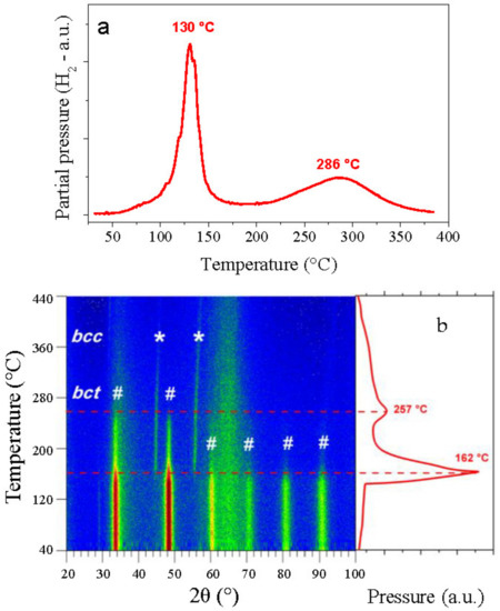 To further investigate the hydrogen desorption properties, thermo-desorption spectroscopy (TDS) analysis and in situ nD were performed during constant heating with 1 °C/min under dynamic secondary vacuum (Figure 5). The TDS profile in Figure 5a shows a main sharp desorption peak at around 130 °C with an onset temperature at 110 °C, followed by a second broad desorption event at 286 °C. For nD characterization, a deuterated sample was submitted to a constant heating rate of 1 °C/min while under dynamic vacuum, and the neutron diffraction data was collected every 15 s. Figure 5b contains the thermo-diffractogram obtained from 40 °C to 440 °C, along with the pressure variation in the secondary vacuum instrument.