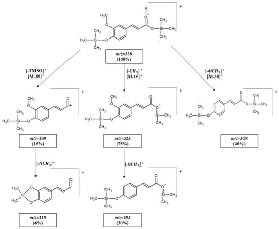 Cis-FA and trans-FA are geometric isomers with very similar structures but can be well distinguished by the order of elution during gas chromatography (trans-FA is retained about 1 min longer than cis-FA) (Figure S3) and by the intensities of some fragment ion signals in their similar mass spectra (Figure S4, Supplementary Materials). Differences include the intensities of fragment ion signals at m/z 323, m/z 308, m/z 293 and m/z 249, where they are more intense for cis-FA than for trans-FA. A molecular M+• peak is observed at m/z 338 and is the highest peak in both spectra. The loss of a methyl group from the molecular ion resulted in the fragment ion m/z 323, and further loss of the methoxy (-O-CH3) group produced the ion at m/z 293. Loss of the methoxy group from the main molecule led to the formation of the m/z 308 ion. Loss of the TMSO group from the molecular ion provided the m/z 249 ion, and further elimination of the -OCH3 group led to the fragment ion at m/z 219. The ion at m/z = 73 is the trimethylsilyl moiety and is characteristic of TMS derivatives [49]. The proposed scheme for the fragmentation pathway of derivatized trans-FA is presented in Figure 3.