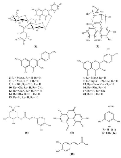 Structures of polyphenolic compounds from C. viminalis aerial parts. Glc: Glucose, Gala: Galactose, GlcA: Glucuronic acid, Man: Mannose, ManA: Mannuronic acid, Rha: Rhamnose.