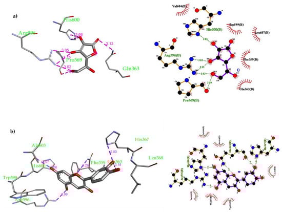 Compound 2 was docked inside the 5-LOX active site using the same parameters and 9 possible conformers were obtained with higher affinity than ascorbic acid ranging from −7.1 to −8.0 kcal/mol. Compound 2 was found to form several non-covalent interactions inside the 5-LOX active site (Figure 4a): (1) H-bonds with His367 (3.19 Å), Gln363 (2.87 Å and 3.14 Å) and His600 (3.10 Å); (2) Van der Waals interactions with Leu368, Ala410, Trp599 and Leu607. Additionally, Compound 3 was docked inside the 5-LOX and 9 conformers were obtained with moderate affinity ranging from −6.4 to −7.4 kcal/mol (see Supplementary Materials). Furthermore, compound 7 was also docked, and 9 conformers were obtained with better affinity ranging from −6.9 to −8.1 kcal/mol. Several non-covalent interactions were formed between compound 7 and the 5-LOX amino residues (Figure 4b): (1) multiple H-bonds with Gln363 (2.70 Å), His367 (3.02 and 3.59 Å) and Leu414 (3.02 Å); (2) Van der Waals interactions with Ala410, Leu414 and Trp599. Compound 16 was docked inside the 5-LOX active site and 9 conformers were obtained with strong affinity ranging from −7.2 to −8.3 kcal/mol. This compound was found to have the best fitting among all compounds docked.