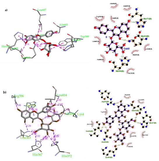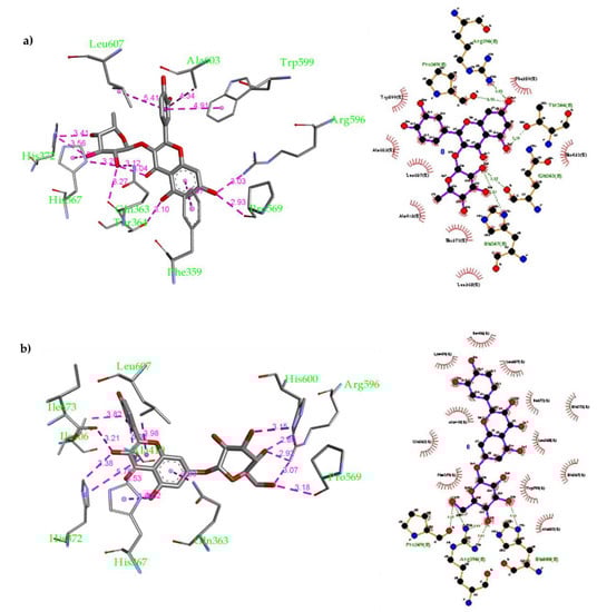 Compound 16 was found to form more non-covalent interactions than others (Figure 5b): (1) H-bonds with Gln363 (3.05 and 3.12 Å), Thr364 (2.81 Å), His367 (3.12 Å) and Pro569 (2.51 Å), Arg596 (3.03 Å); (2) Van der Waals interactions with Phe359, Trp599, Ala603 and Leu607. In addition, compound 17 was docked as well and 9 conformers were obtained with affinity ranging from −6.9 to −8.1 kcal/mol. This compound was found to have good fitting inside the 5-LOX active site. Compound 17 was found to form several non-covalent interactions (Figure 5b): (1) H-bonds with His367 (2.64 Å), Arg596 (3.07 and 3.38 Å) and His600 (3.13 Å); (2) Van der Waals interactions with His372, Ile406, Ala410 and Leu607. The docking results suggest that all the six polyphenolic compounds are well-fitted inside the human 5-LOX active site and exert binding affinity greater (more favorable) than ascorbic acid and quercetin. It is expected that these compounds will exhibit a good in vitro profile for inhibiting human 5-LOX through occupying its active site preventing the conversion of Fe2+ to Fe3+ that activates the enzyme. Additionally, compound 17 has a good chance to further in vivo use as it could survive through human digestion, get absorbed then inhibit human 5-LOX at its site of action.
