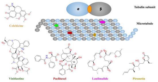 Schematic representation of the tubulin-binding sites on microtubules and chemical structures of representative inhibitors of the Tub-Mts system [2].