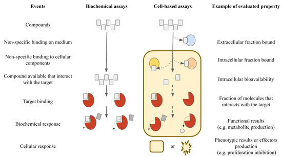 Virtual screening methods initially deal with many compounds, until they are reduced to a manageable quantity [16]. Each type of evaluation has its challenges and complexity in regard to in vitro assays (e.g., biochemical or cell-based assays). It is not uncommon that compounds which are active in biochemical assays are inactive in cell-based assays. Each system (biochemical or cell-based assays) allows for analyzing the properties of different compounds, evaluating their pros and cons depending on the costs and how representative each system can be for the proposed study. This is shown schematically in Figure 2 [17].
