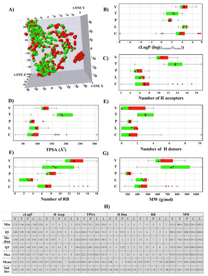 Overview of physicochemical properties of 851 compounds tested in cell-based assays. Compounds are colored by ranges of biological activity values: Green as active (<1 µM) and red as less-active (>1 µM). The compounds were grouped by binding site: vinca site (V), paclitaxel site (T), pironetin (P), laulimalide (L), and colchicine site (C). (A) Visual representation of the chemical space using t-SNE; (B–G) Box plots of the drug-like properties commonly used in the drug design and development process. (B) cLog P; (C) number of H bond acceptors; (D) TPSA (topological surface area); (E) number of H bond donors; (F) RB (rotatable bonds); (G) MW (molecular weight). The boxes enclose data points with values in the first and third quartile. The red and black triangles denote the mean and median distributions, respectively. The data points outside of the boxes indicate outliers; (H) Summary statistics of the dataset.
