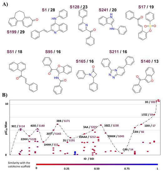 Scaffold content analysis of compounds with activity against Tub-Mts system using cell-based inhibition data. (A) Frequency of most common scaffolds. The scaffolds were generated using Bemis and Murcko’s definition; (B) scaffolds of the most active compounds and activity differences. The pIC50 values plotted were the most active values reported independently of the cell line (pIC50 Max). Each compound identifier (ID) and each scaffold identifier (SID) are shown for each structure. Each scaffold is colored by the low (red) or high (blue) similarity value to the colchicine’s Bemis and Murcko scaffold.